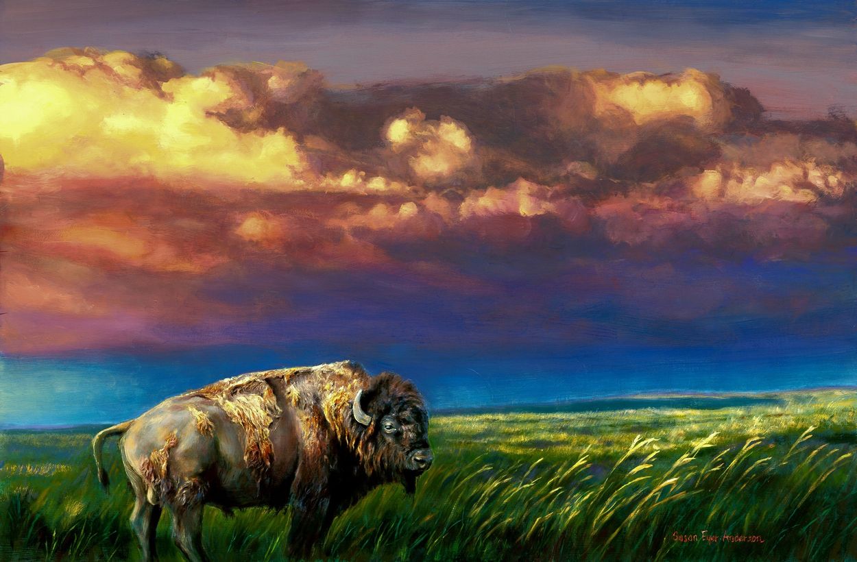 "Moment of Tranquility" 40" x 30" oil on linen. A Cheyenne woman overlooking her homeland by horseback in the sunset. Photo Karen Voepel