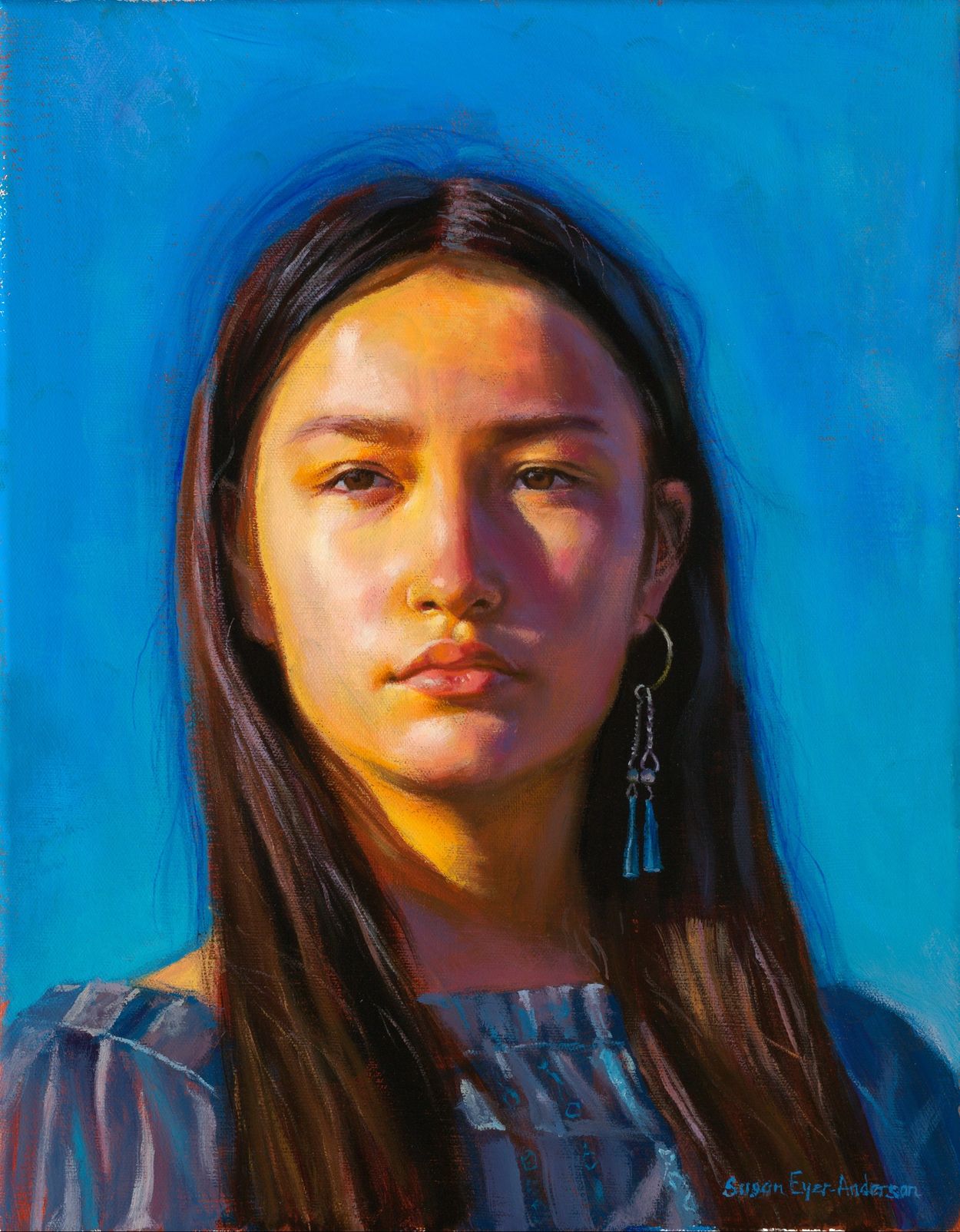 "Under the Willow" 24" x 18" oil on linen. A young Cheyenne woman standing under a willow tree in dappled sunlight. Photo reference: Karen Voepel