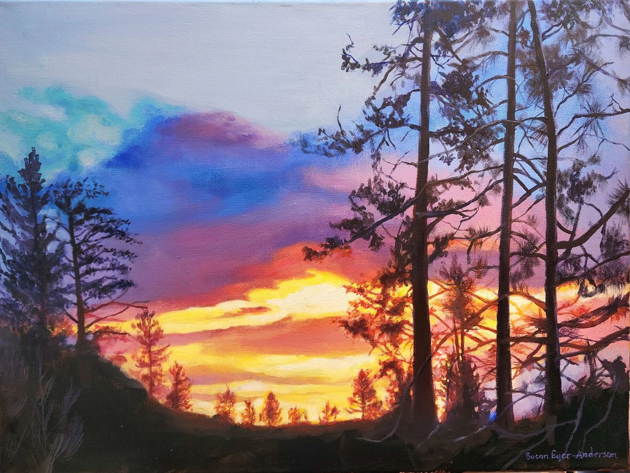"Manzanita Sunset" 18" x 24" oil on panel. A rider running along ina a beautiful sunset. That view was actually out our front door in Anza, Ca.